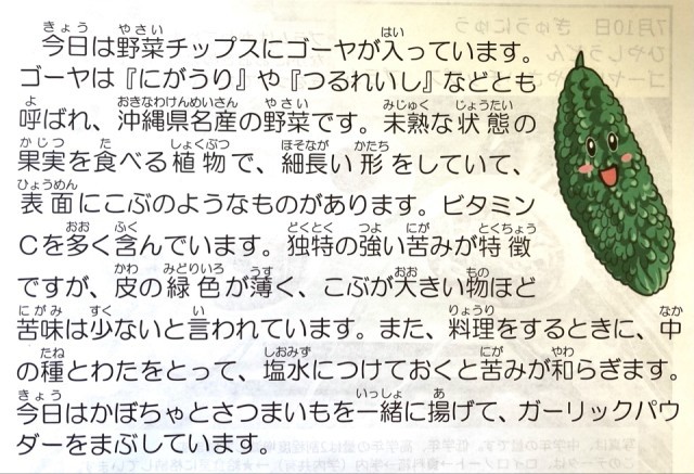 ゴーヤ入りやさいチップスのゴーヤは、ちょっと苦いけど、ビタミンCやミネラル、食物繊維を多く含んでいます。私も今年は市役所のゴーヤの苗木配布に応募して、プランターで育てています。まだ実はできませんが、グリーンカーテンとして役に立っています。