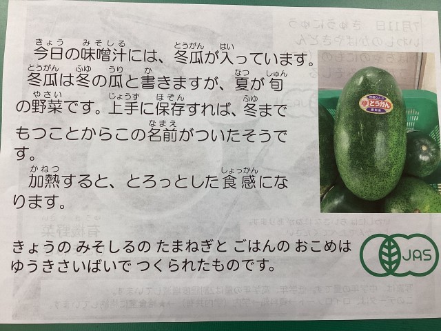 今日は、いわしの蒲焼き丼、かぼちゃの煮物、冬瓜の味噌汁、牛乳です。