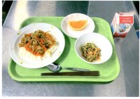 今日は、かき玉うどん、野菜のピリカラ、フルーツ白玉、牛乳です。フルーツ白玉は、リ...