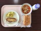 今日はダイスチーズパン、鮭のハーブ焼き、ミネストローネ、さつまいものクリーム煮、...