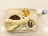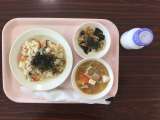 今日の給食は、ビビンパ、ナムル、卵と青菜のスープ、いちご、牛乳です。日本ではビビ...
