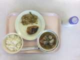 今日は、かしわ寿司、豚汁、ごまドレサラダ、牛乳です。「かしわ寿司」というのは、あ...