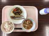 梅ちりごはん、ししゃものから揚げ、里芋と厚揚げのそぼろ煮、大根とひじきのサラダ、...