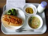 きょうは、セルフチリサンド、牛乳、茹でブロッコリー、コーンと卵のスープ、スイート...