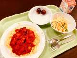 今日は、なすとトマトのスパゲッティ、ポテトチップスサラダ、巨砲、牛乳です。 ちょ...