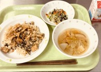 今日は、さんまのかば焼き丼、野菜ののりじゃこ和え、吉野汁、牛乳です。近年は、さん...