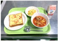 今日は、アップルトースト、ポークビーンズ、粗挽き大豆のサラダ、牛乳です。さっぱり...