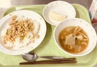 今日は、そぼろ丼、根菜の味噌汁、果物(梨)、牛乳です。そぼろ丼は、丼なので箸で食...