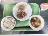 今日の給食は、ビビンバ、ねぎスープ、キョンダン(白玉団子)、牛乳です。韓国メニュ...