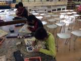 図工の時間です。彫刻刀を使って、版画を作っています。