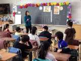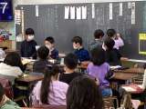 3年生が学級会で自分の意見を書いている場面、日本語で五色百人一首に取り組んでいる...