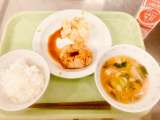 今日の給食は、キムチ焼きそば、豆腐と玉子のスープ、キャラメルポテト、牛乳です。ま...