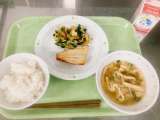 今日の給食は、ごはん、ほっけの一夜干し、野菜のおかかあえ、大根と油揚げのみそ汁、...