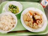 今日は、茶飯、おでん、野菜の浅漬け、牛乳です。 茶飯とおでん、おでん屋さんの定番...