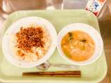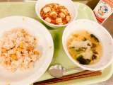 今日は、チャーハン、麻婆豆腐、ワンタンスープ、牛乳です。 麻婆豆腐をチャーハンの...