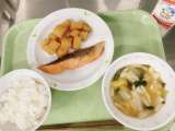 今日の給食は、ごはん、鮭の塩麹焼き、じゃがいもの煮つけ、白菜のみそ汁、牛乳です。...