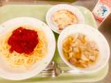 今日は、トマトソーススパゲッティ、ジェノベーゼポテトのチーズ焼き、牛乳、ミシュー...