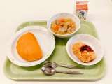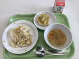 今日は、カラフルピラフ、ポテトのチーズ焼き、ジュリアンスープ、牛乳です。カラフル...