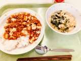 今日は、麻婆丼、にら玉スープ、牛乳です。 辛さを抑えた麻婆豆腐ですが、かすかに辛...