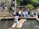 池の広場では、「いかだ走り」や「丸太を渡たり」また、いかだのようなもので水面を移...