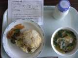 チャーハンおにぎり・牛乳・ワンタンスープ・きゅうりの中華味 今日はスポーツフ...