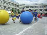 午前の部、最後の競技は、全学年による「大玉送り」。 黄色、青、赤、緑の各色が、一...