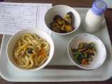 今日は、カレーうどん、牛乳、ごまあえ、りんご入り大学芋です。 メモは、かれーうど...