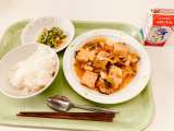今日は、ごはん、常家豆腐(ジャージャンどうふ)ごま塩ナムル、牛乳です。 常家豆腐...