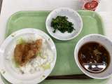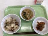 今日の給食は、きんぴらおこわ、鶏肉のから揚げみぞれだれ、沢煮わん、牛乳です。大好...