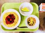 今日は、ミートボールのスパゲッティ、コーンサラダ、メロン、牛乳です。 ミートボー...