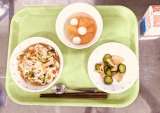 今日は、かき玉うどん、野菜のピリカラ、フルーツ白玉、牛乳です。 かき玉うどんにフ...