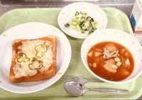今日は、ピザトースト、ポークビーンズ、グリーンサラダ、牛乳です。スポーツフェスタ...