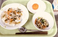 今日は、豚キムチ丼、わかめサラダ、フルーツ白玉、牛乳です。キムチは、そのまま食べ...