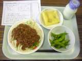今日は、冷やし肉みそうどん、牛乳、茹で枝豆、パンプキン蒸しパンです。 メモは、枝...