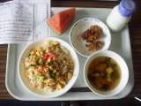 今日は、キムチ丼、牛乳、コーンポテト、ホワイトゼリーです。 メモは、キムチ丼のご...