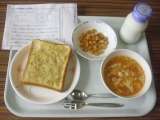 今日は、ツナポテトトースト、牛乳、カレービーンズ、トマトとだまごのスープです。 ...
