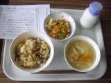 今日は、梅わかごはん、牛乳、豆入り筑前煮、華風あえです。 メモは、筑前煮に使われ...