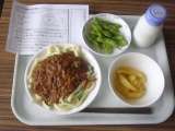 今日は、冷やし肉みそうどん、牛乳、スパイシーポテト、ゆで枝豆です。 今日は、6月...