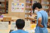 子どもたちの大好きな図書の時間です。司書の先生のところに集まって読み聞かせを行う...