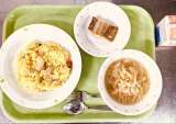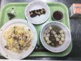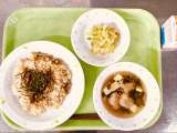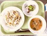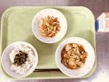 今日は、青菜ふりかけご飯、高野豆腐の卵とじ、揚げじゃがいもとれんこんのきんぴら、...