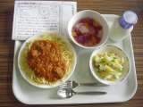 今日は、ヘルシーミートソース、牛乳、キャベツサラダ、フルーツベジポンチです。 メ...