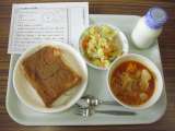 今日は、きなこバタートースト、牛乳、ポテト入りフレンチサラダ、ボルシチです。 メ...