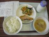今日は、ごはん、牛乳、鮭の塩焼き、華風あえ、豚汁です。 メモは、塩焼きにした“鮭...