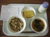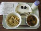 今日は、豆入りひじきごはん、牛乳、切り干し大根の卵焼き、すまし汁です。 メモは、...