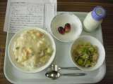 今日は、クリームライス、牛乳、ハムと大根のサラダ、甲斐路です。 メモは、デザート...