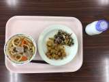 今日は肉うどんです。29日で肉の日だから、肉うどんですかね。大学芋、満点サラダ、...