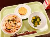 今日は、五目うどん、きゅうりのピリカラ、スィートポテト、牛乳です。 うどんには、...