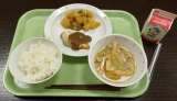 今日のメニューは、ご飯、鯖のごま山椒焼き、じゃがいもの煮付け、野菜の味噌汁、牛乳...