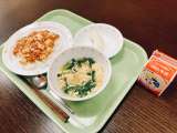 今日は、麻婆丼、にら玉スープ、梨、牛乳です。 給食の麻婆丼は、辛くないので食べや...