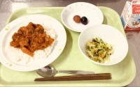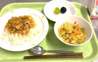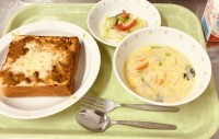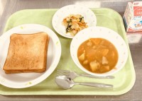 今日は、ドライカレートースト、野菜のクリームスープ、グリーンサラダ、牛乳です。ド...